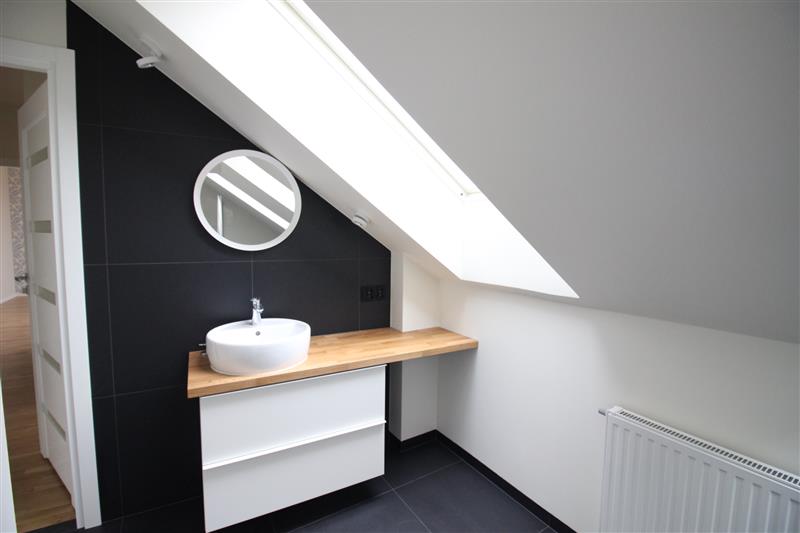 wygodnej łazienki z oknem dachowym i kabiną prysznicową,